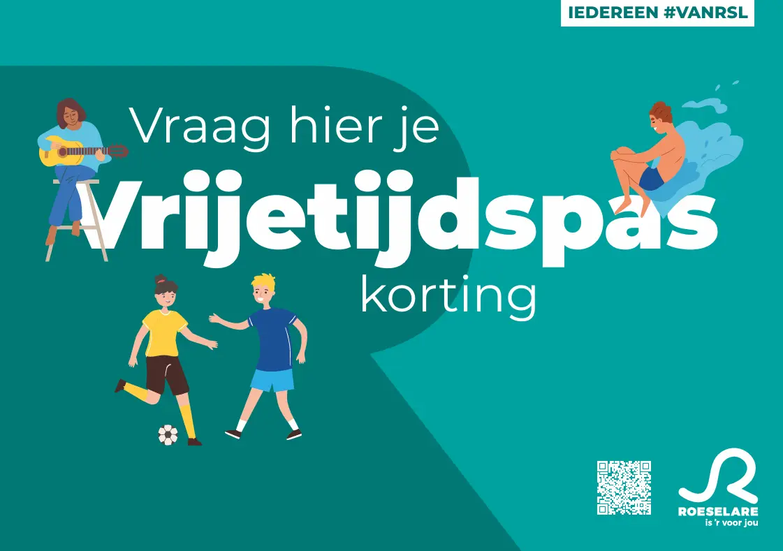 We werken graag samen met de initiatieven die de stad neemt om vrije tijd en sport zo toegankelijk mogelijk te maken. Inwoners van Roeselare die houder zijn van een vrijetijdspas kunnen 50% korting krijgen op onze lidmaatschappen en opleidingen.